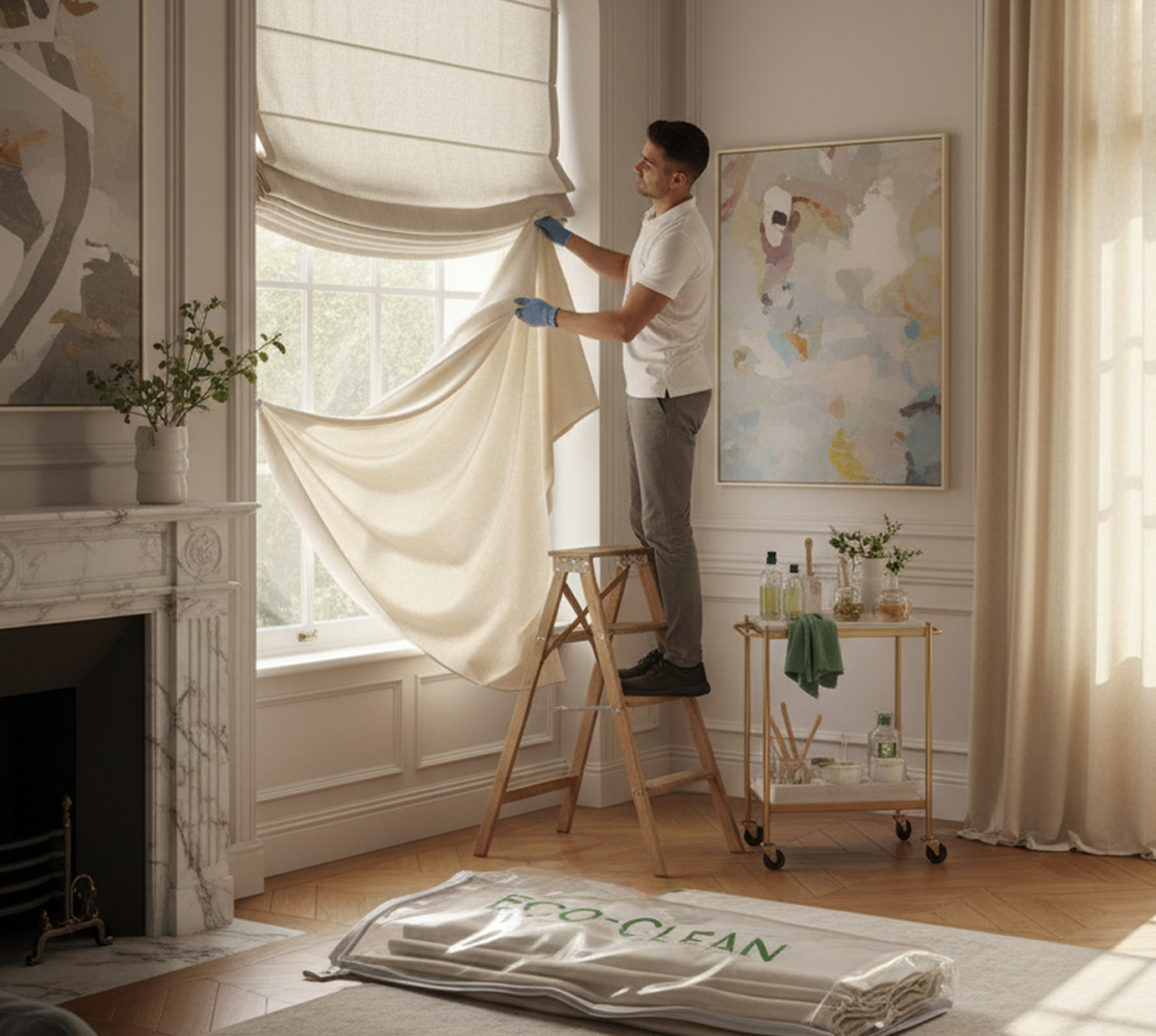 Yes — our team removes your curtains or Roman blinds, has them professionally dry cleaned, ironed, and steamed, and rehungs them within 72 hours.